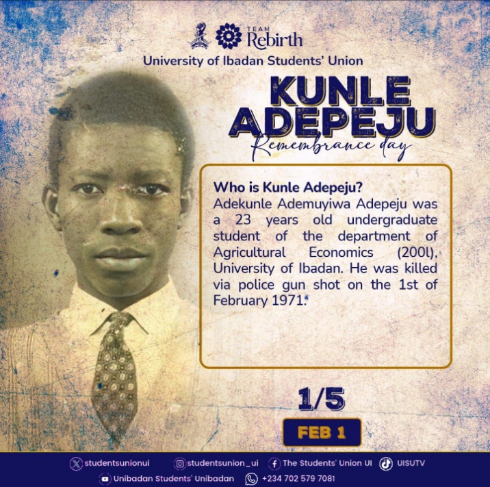 Over the years, important historical events that remind of heroic personality have been reduced to mere partying and whining. We tend to forget the main purpose of remembrance ceremonies as years go by and if purpose is forgotten, essence will be missing. There is however the need to ask if our union is learning from our past heroes or not. The Student Union Government of the University of Ibadan under the administration of Team Rebirth led by Samson Samuel Tobiloba sets aside February 1, 2024 to remember Adekunle Adepeju, a 200L student of the department of Agricultural Economics, University of Ibadan who was shot on 1st February, 1971. He was reported to have died at 23 while trying to rescue another student who was injured during a demonstration by students over low quality of welfare and catering in the university. An official public release, signed by the incumbent president of the union, was issued on 31st of January, 2024 to invite students to join in the event of the remembrance of the deceased tagged “53rd Remembrance day for Kunle Adepeju.” The scheduled activities of the day were graveyard visitation, candle night and gyration.