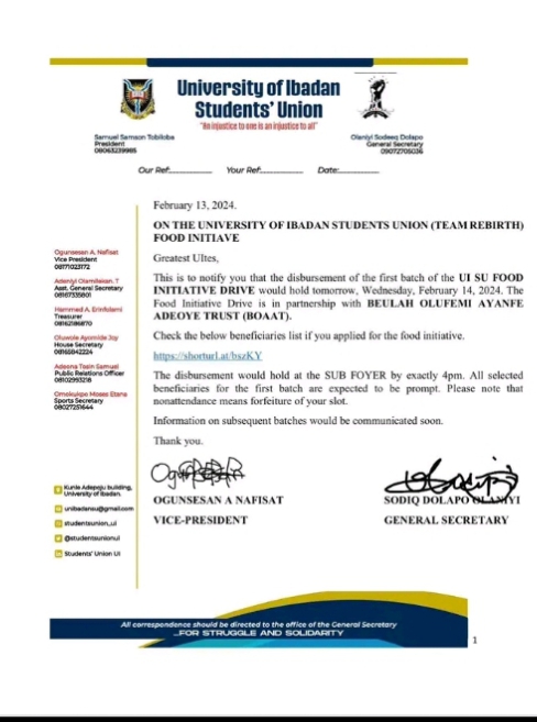 In the memo release, it states that this is the first batch of the UISU Food Initiative, and it is in partnership with Beulah Olufemi Ayanfe Adeoye Trust (BOAAT).