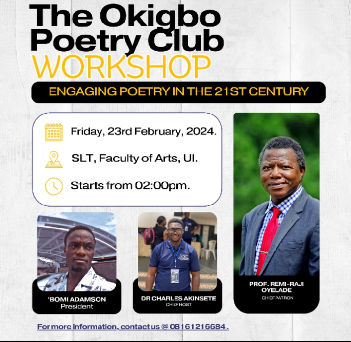 The Okigbo Poetry Club of the University of Ibadan is set to hold the maiden edition of her poetry workshop at the Faculty of Arts, SLT on the 23rd of February 2024, and the event aims to reignite the spirit of dying poetry in the 21st Century.