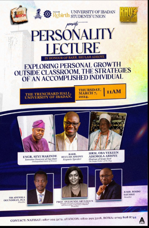 The Student Union, University of Ibadan held a personality lecture on the 7th of March, 2024 at the International Conference Centre Hall in honour of Barr. Beulah Adeoye during her UI’SU week as the lecture was themed “Exploring Personal Growth outside the Classroom. The Strategies of an Accomplished Individual”.