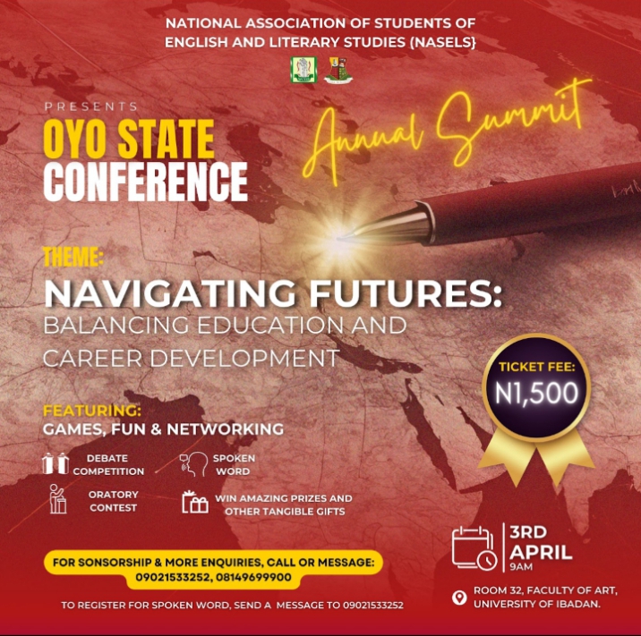 The National Association of Students of English and Literary Studies (NASELS) of tertiary institutions in Oyo State, is set to hold an annual summit of the Oyo State Conference on the 3rd of April, 2024, at Room 32, Faculty of Arts, University of Ibadan.