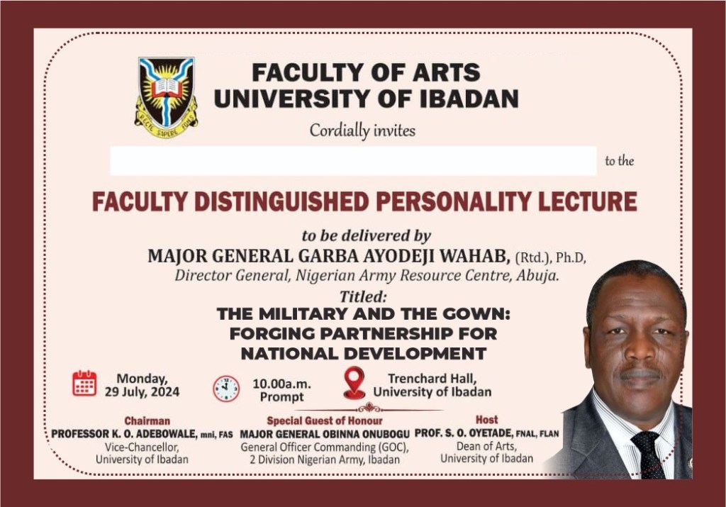 He made this known in the personality lecture titled: THE MILITARY AND THE GOWN:FORGING PARTNERSHIP FOR NATIONAL DEVELOPMENT organized by the Faculty of Arts at Trenchard Hall, University of Ibadan.