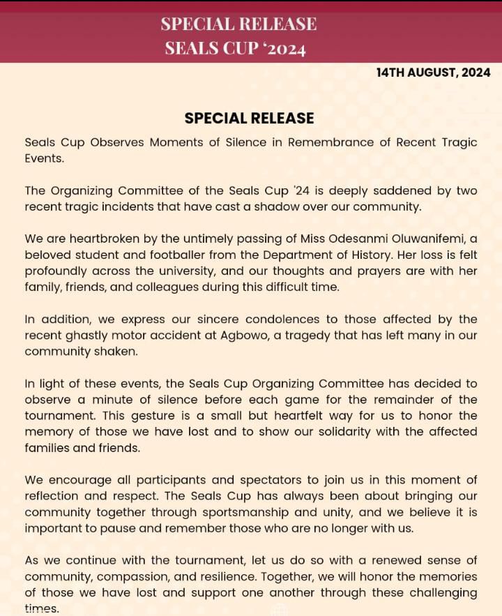 The committee, through a memo released, offered its condolences to the families, friends and colleagues of Miss Odesanmi Oluwanifemi, a footballer from the Department of History who passed away recently.