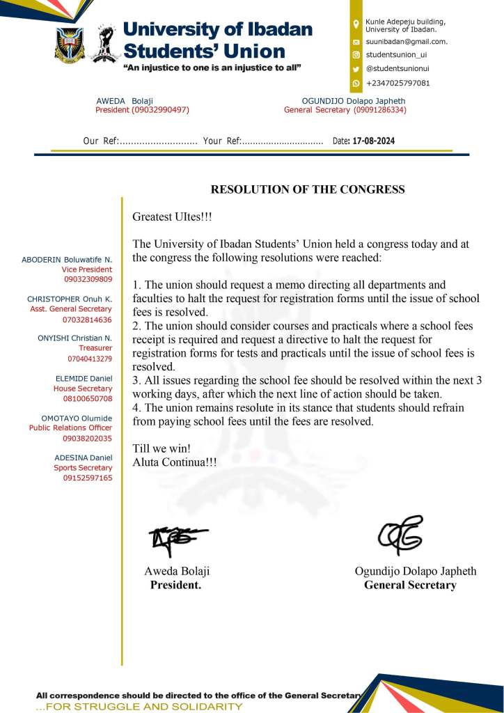 After the Congress that was held on August 17, 2024, the University of Ibadan Student Union (UISU) released a memo that stated the resolutions of the Congress