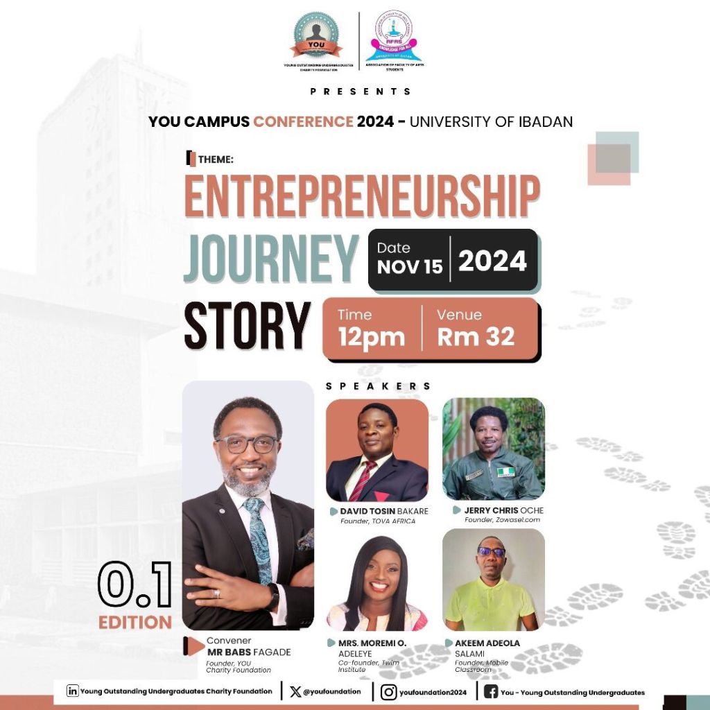 On Friday 15th November, 2024, The Youth Outstanding Undergraduates Charity Foundation (YOU) in collaboration with the Association of Faculty of Arts Students, University of Ibadan organised the first edition of its kind tagged YOU CAMPUS CONFERENCE 2024: “ENTREPRENEURSHIP JOURNEY STORY”
