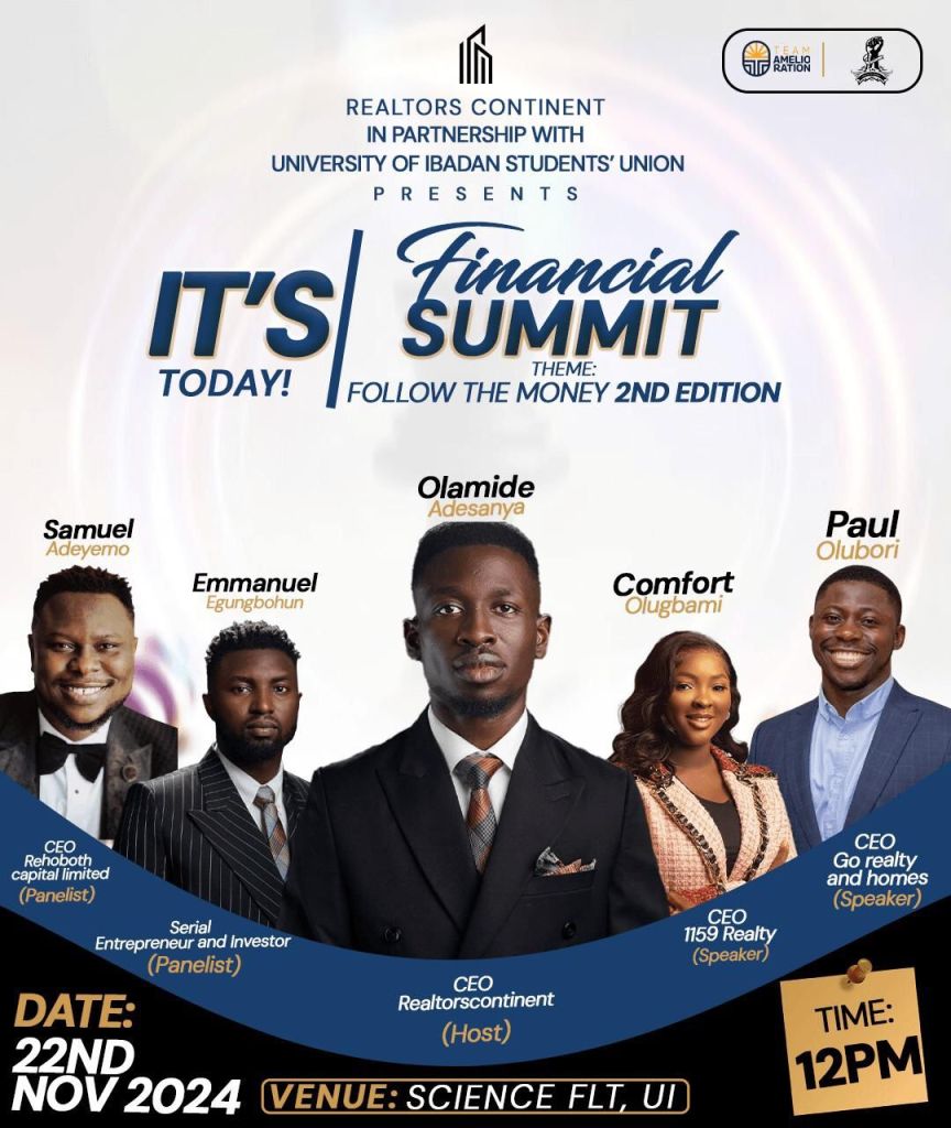 Realtors Continent in partnership with the University of Ibadan Students’ Union, held the second edition of a financial summit themed “Follow the Money” on Friday, November 22, 2024, at Science FLT, UI.