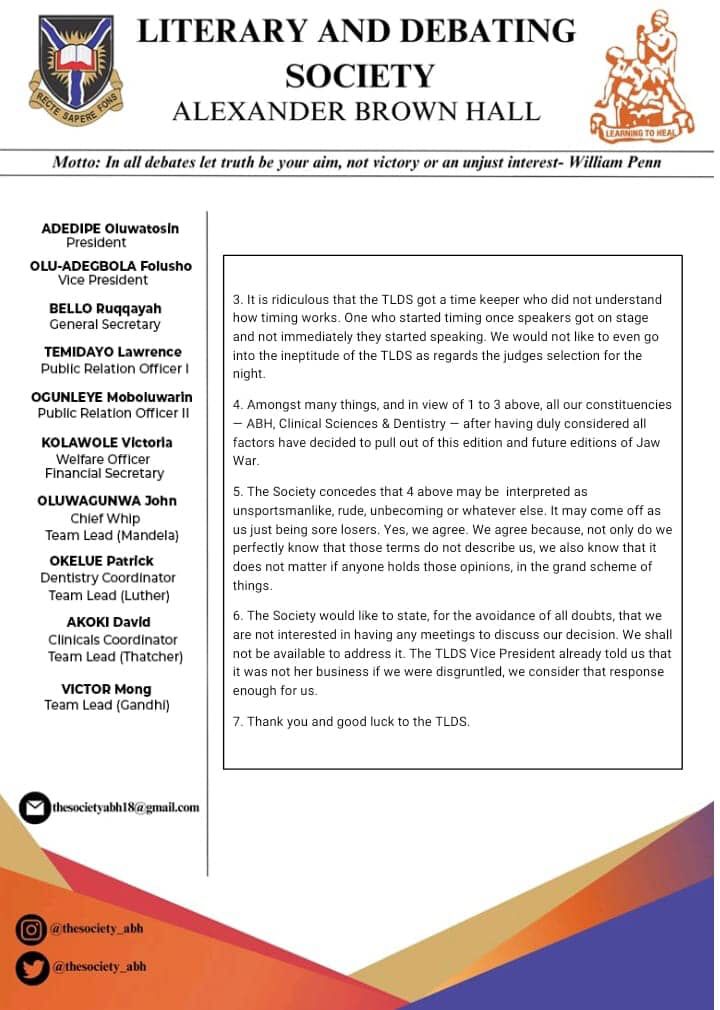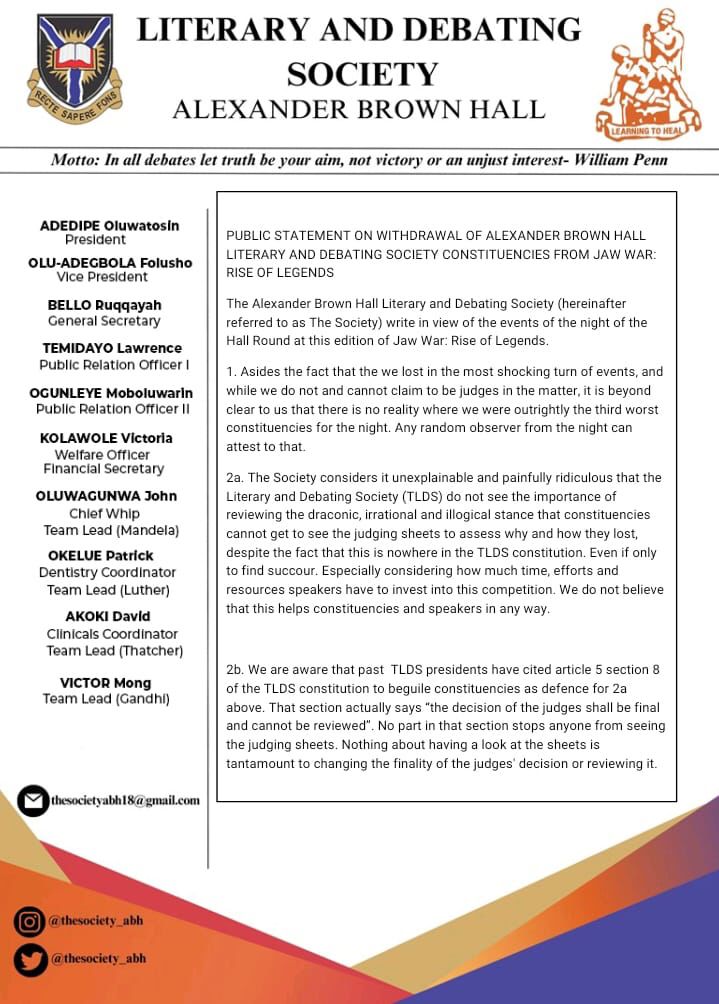 Alexander Brown Hall, Literary and Debating Society, University of Ibadan, on the 27th November, 2024 released a public statement of withdrawal from JAW WAR after they were defeated by Obafemi Awolowo hall at the first leg.