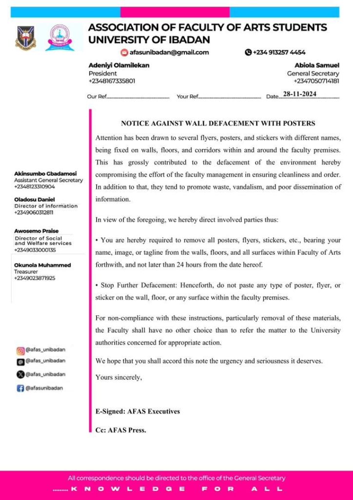 The Association of the Faculty of Arts Students (AFAS UI) released a notice on the 28th November, 2024 against the defacement of walls with posters.