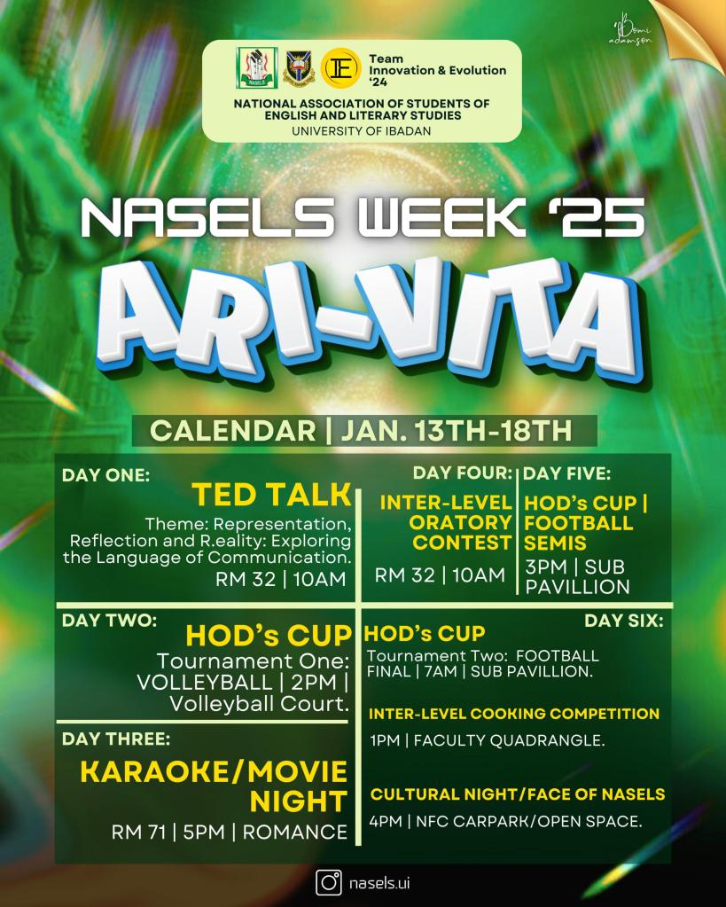 Team Innovation and Evolution’24 of National Association of the Students of English and Literary Studies, University of Ibadan NASELS UI, announces the commencement of the Departmental Week tagged “ARI-VITA,” which is scheduled to hold between January 13-18, 2024.