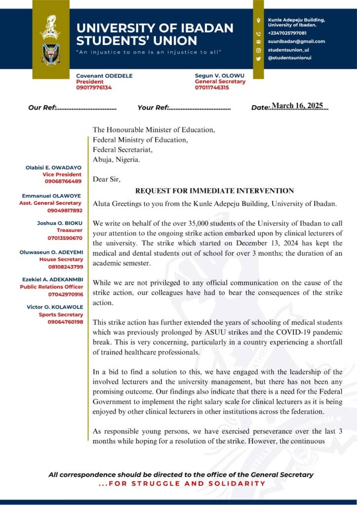 In the late hours of Sunday, March 16, 2025, the leadership of the University of Ibadan Students’ Union has issued a statement which was addressed to the Federal Ministry of Education.