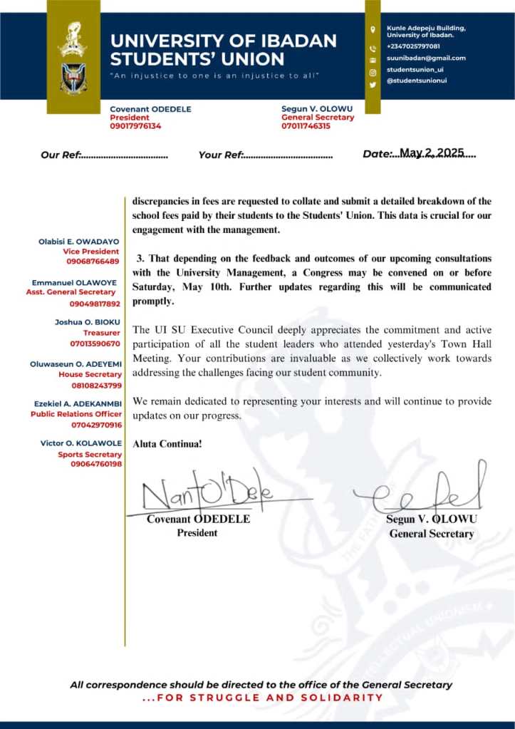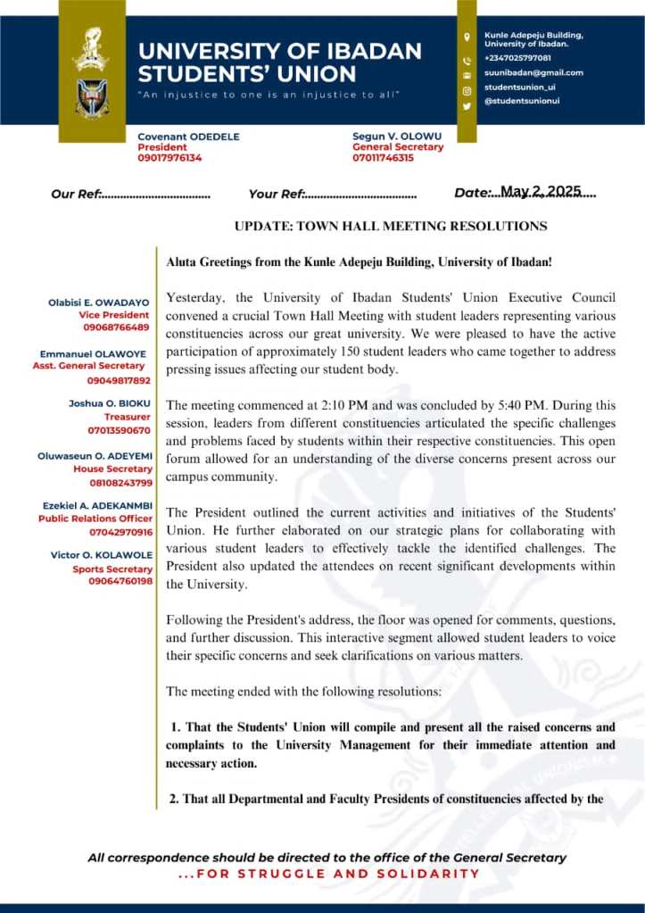 The University of Ibadan Student Union has updated the students on the resolution of the Town Hall meeting held on May 1st, 2025.
