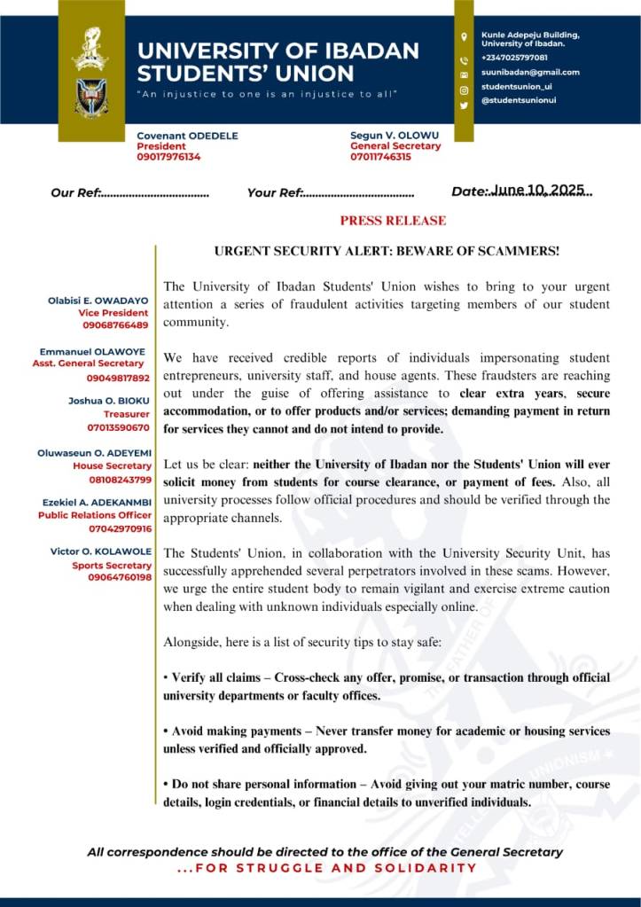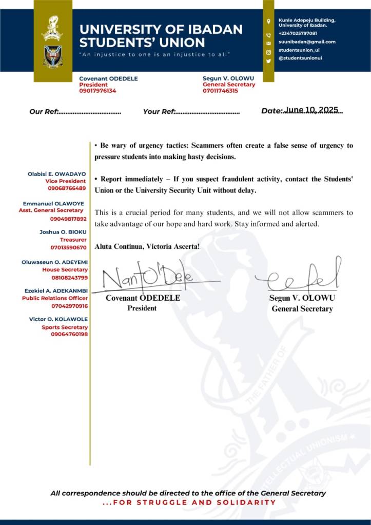 The University of Ibadan Student Union has cautioned the student community against scammers who have been on the rise with fraudulent activities.
